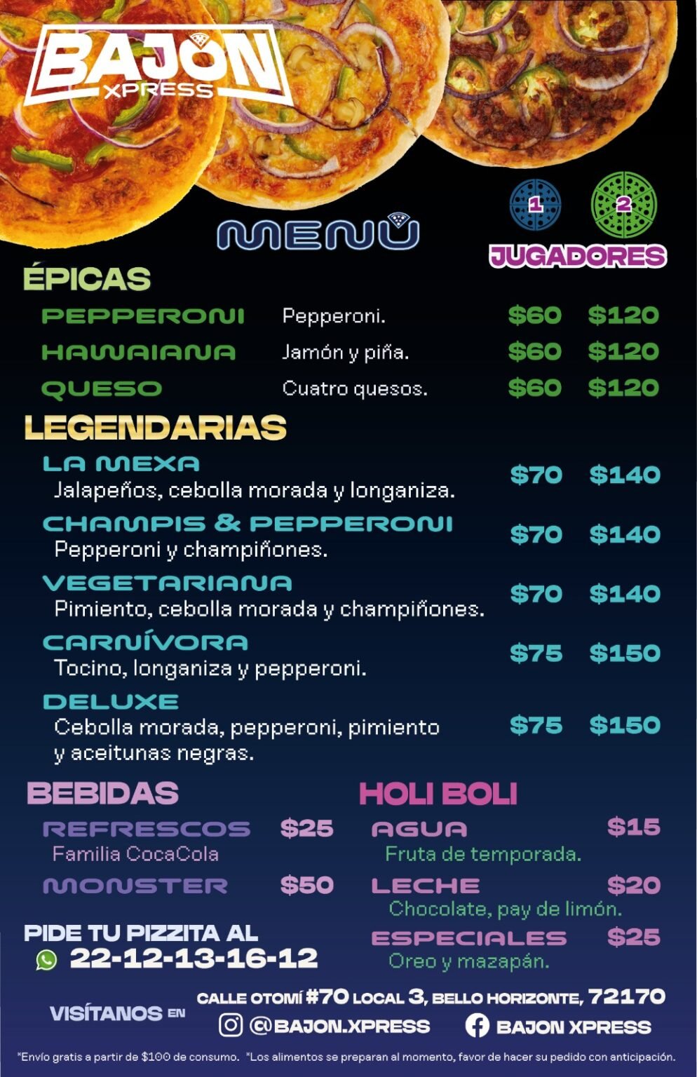 El concepto urbano de Bajón Xpress rompe con lo típico: pizzas con identidad, precios justos y sabor que engancha desde la primera mordida. Aquí vienes a comer chido, a compartir con amigos y a disfrutar un ambiente fresco, sin complicaciones.