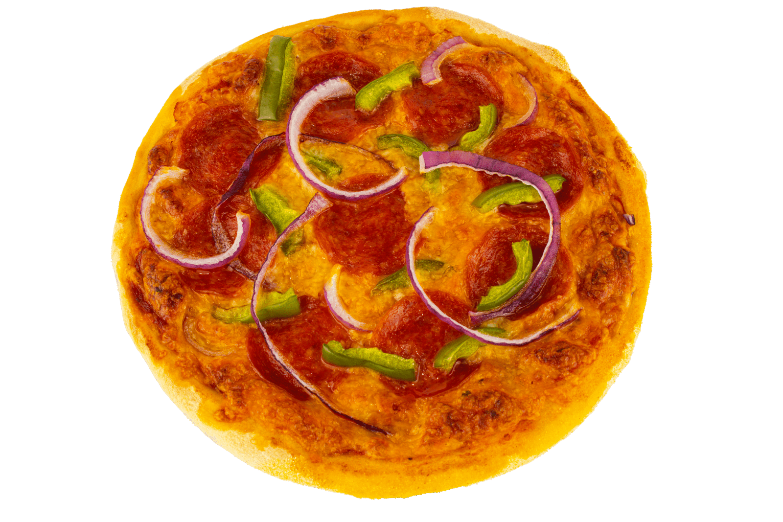 Cebolla morada, pepperoni, pimiento y aceitunas negras.